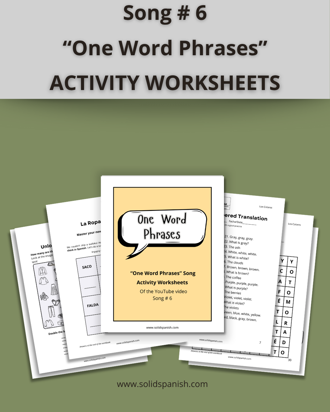 Learn Beginner Spanish with Song #6 "One Word Phrases" Activity Worksheets