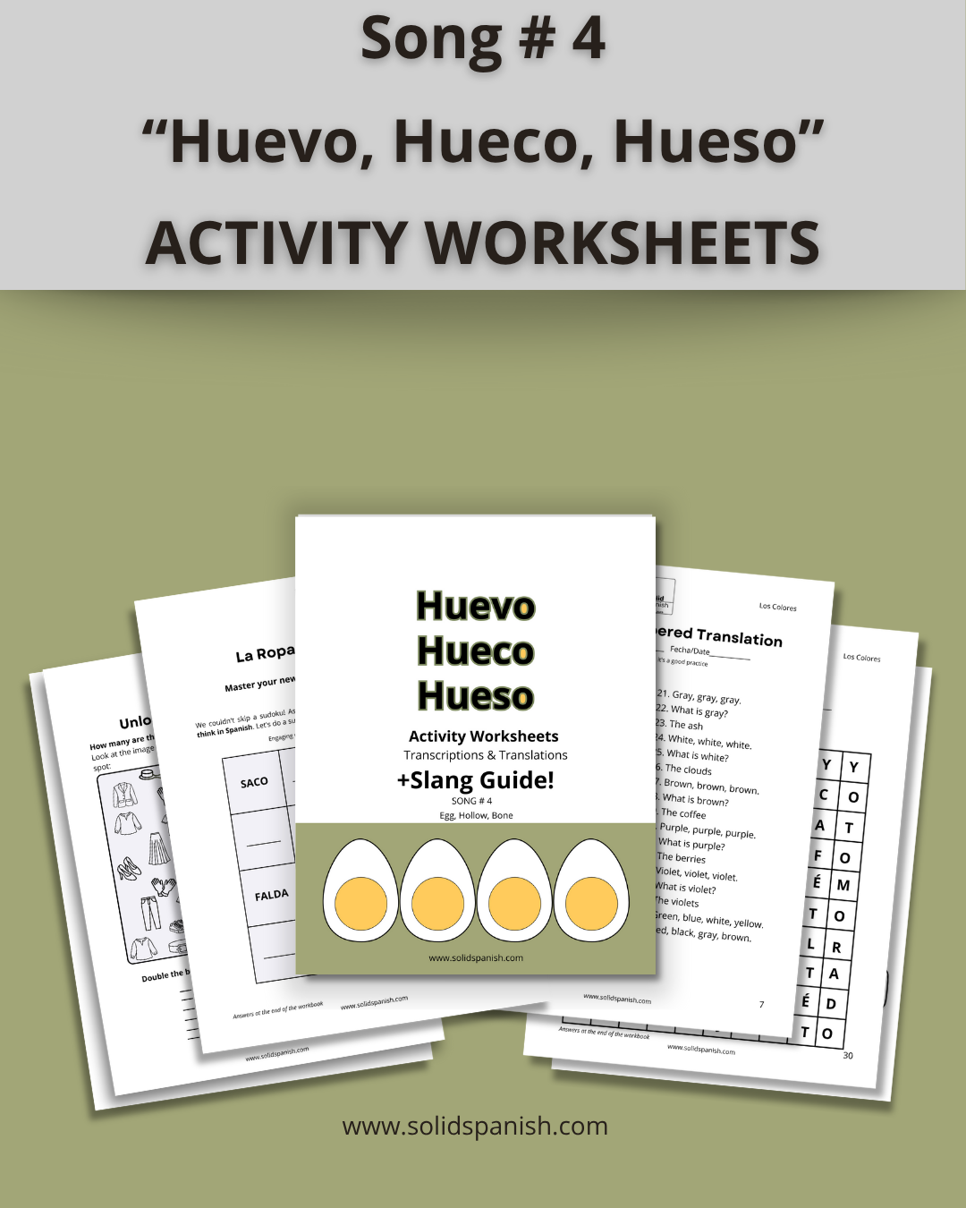Learn beginners Spanish with Song #4 "Huevo, Hueco, Hueso" Activity Worksheets